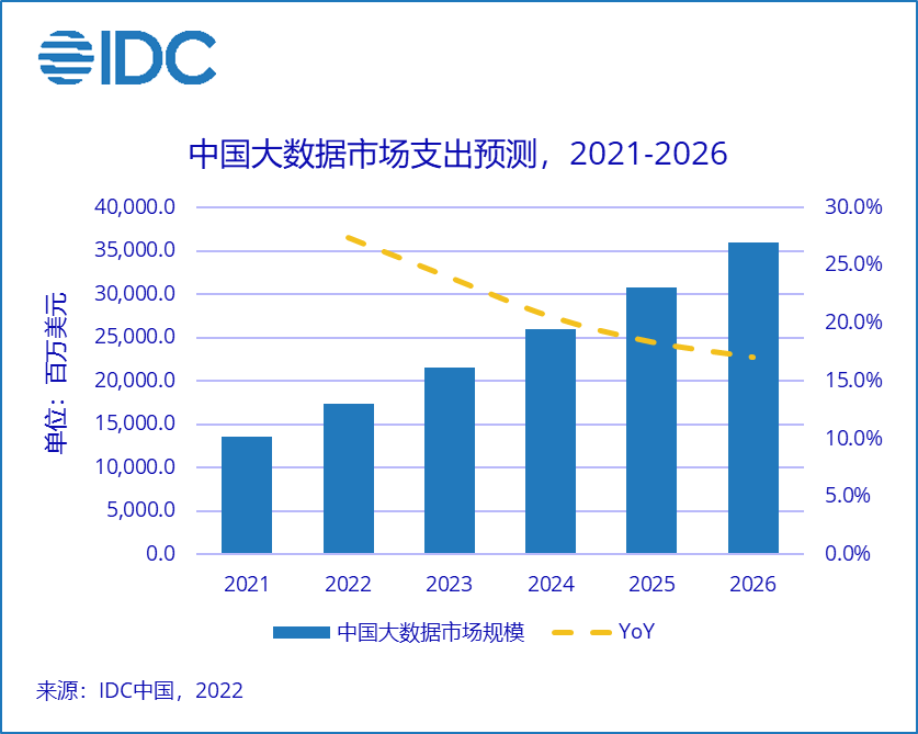 聚集我国商场,IDC估计,2026年我国大数据IT开销规划估计为359.5亿美元,商场规划位列单体国家第二。从增速的视点来看,我国大数据IT开销五年CAGR约为21.4%,位列全球榜首。我国大数据商场增速继续领跑全球,出现出微弱的增加态势,商场前景宽广。跟着数字经济、数字化转型、新基建等出资建造进一步加速,我国终端用户对大数据硬件、软件、服务的需求将稳步扩展。