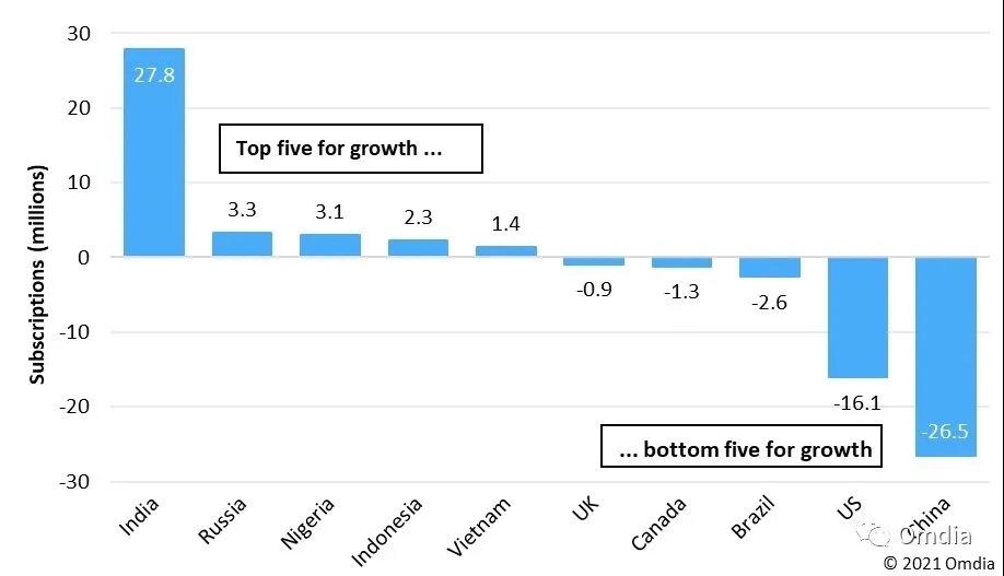 应该着重的是,印度商场上也存在掐线现象,但这在某种程度上被每年新增的电视家庭(其间一些收看付费电视)所掩盖。就现在来说,新增的付费电视家庭总数足以超越抛弃付费电视转而观看在线视频的现有用户数量。因而,虽然Omdia猜测2020-2025年期间印度付费电视订阅用户数将添加2780万(全球抢先的添加规划),但有必要记住的是,印度是一个具有约3亿家庭用户的商场。印度的付费电视普及率在2016年达到了占有电视家庭93%的峰值,但这一份额在2020年降至84%;由此能够看出,从订阅用户数量方面看,预期付费电视用户数的添加规划相对较小。